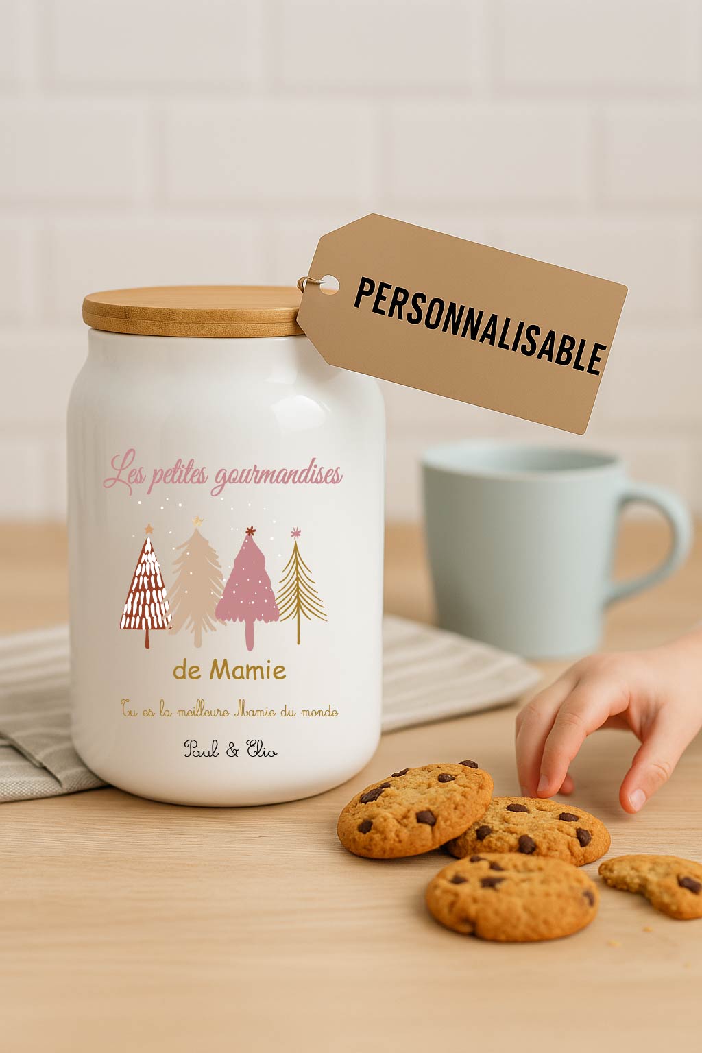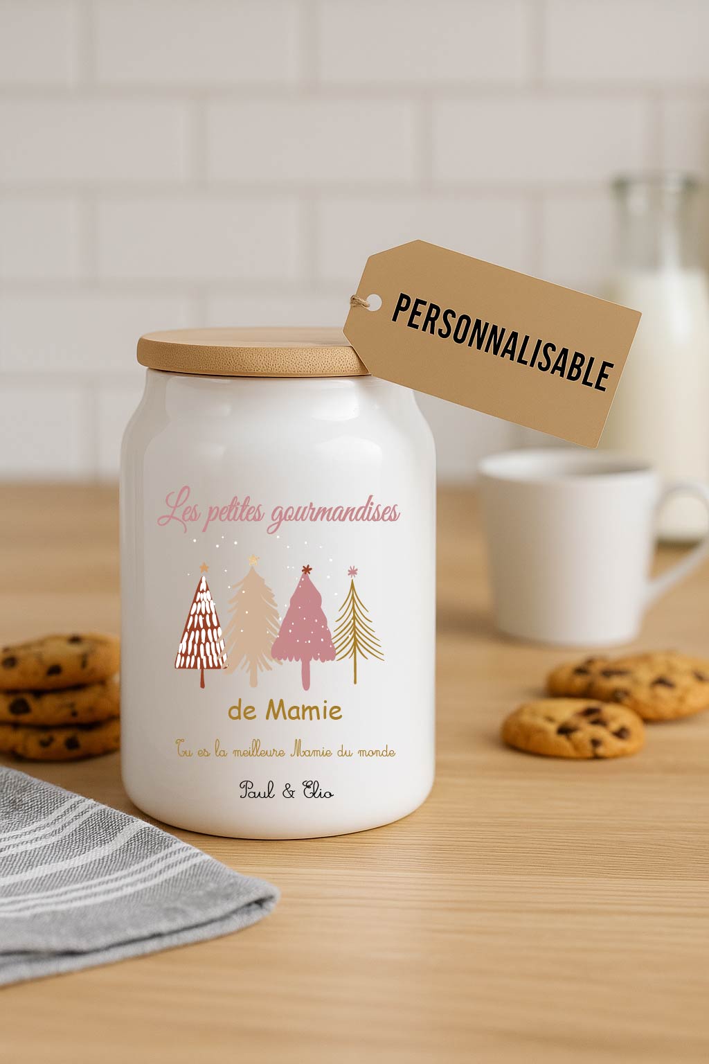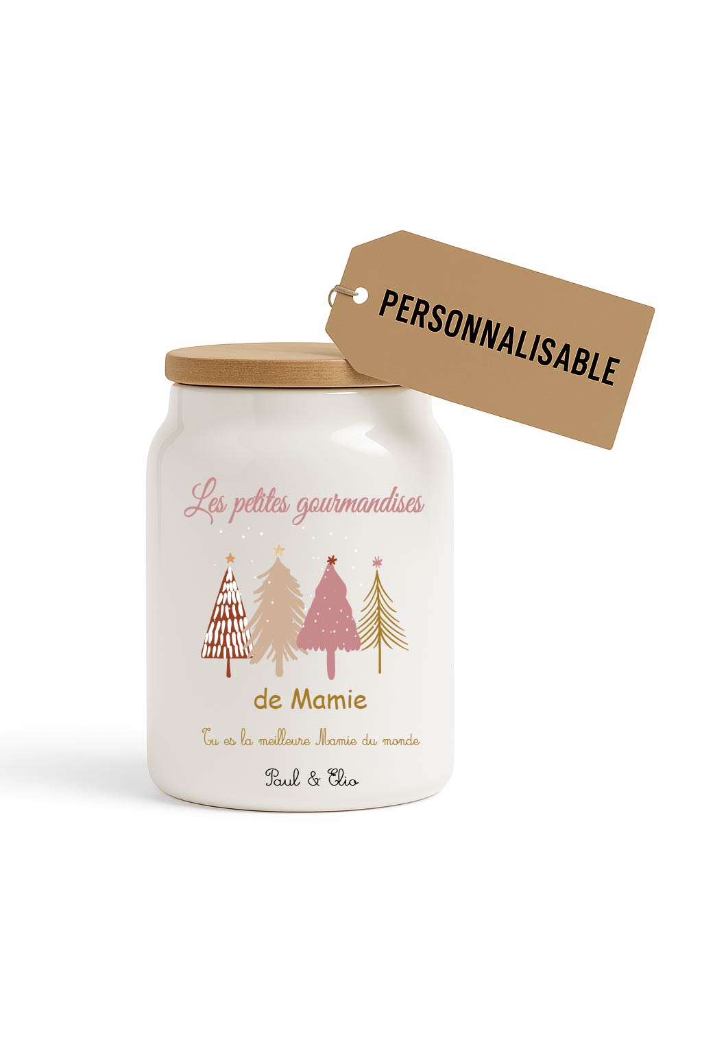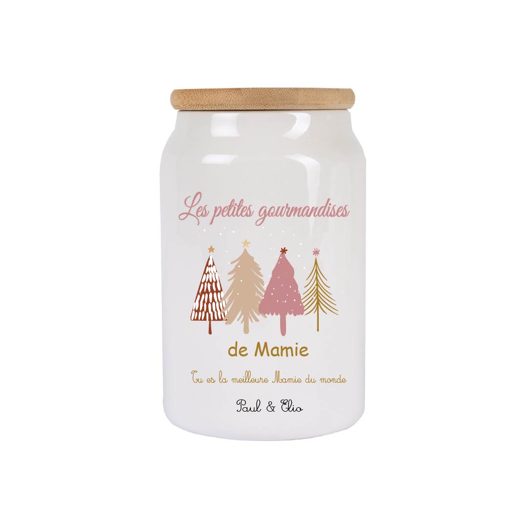 Pot à gourmandises en céramique avec couvercle bois. Tout le texte est personnalisable : titre, surnom (Mamie, Marraine, Nounou…), message et prénoms. Illustration sapins fixe. Idée cadeau Noël petit budget et pleine d’émotion.