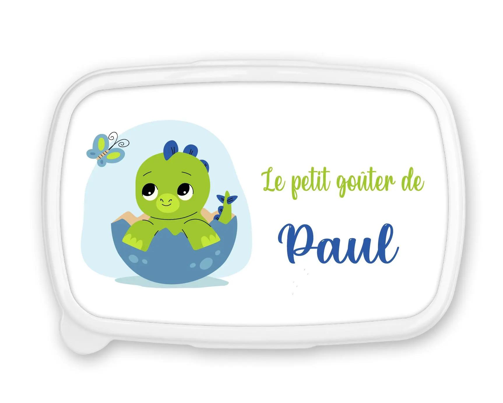Boîte à goûter personnalisée – Motif Dinosaure – Fond bleu – Rentrée scolaire – Prénom personnalisable