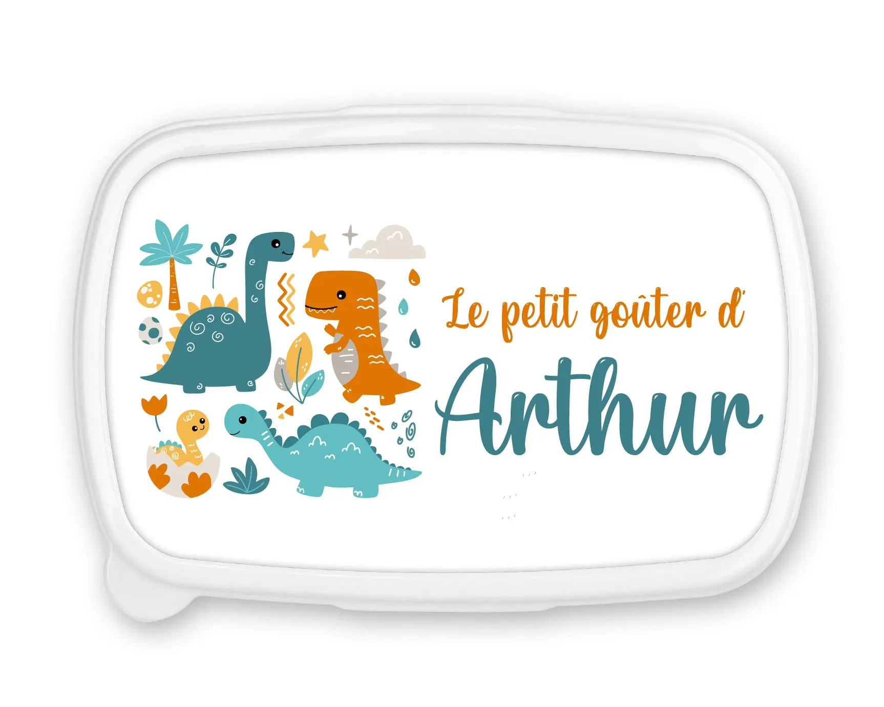 Faites rugir de joie votre petit aventurier avec cette boîte à goûter personnalisée à son prénom ! Décorée de dinosaures mignons et colorés, cette lunch box au fond bleu est parfaite pour accompagner les goûters des enfants en crèche, à l’école maternelle ou en sortie.
