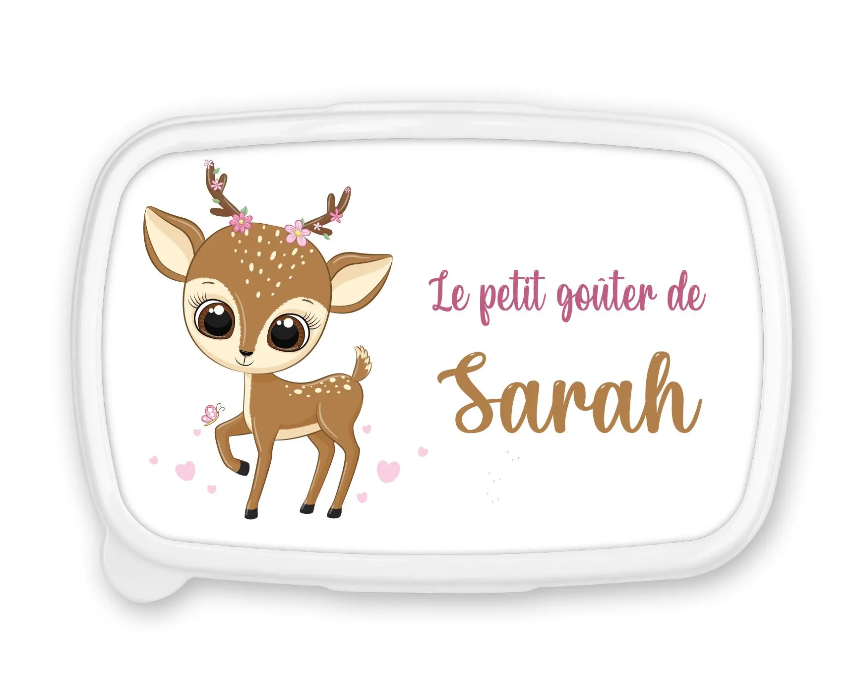 Adorable boîte à goûter personnalisée au prénom de votre enfant, décorée d’un faon fleuri tout en douceur sur fond rose tendre. Cette lunch box au format compact (18,5 x 12,7 x 6 cm) est parfaite pour accompagner les petites filles à la rentrée scolaire, à la crèche ou en sortie.