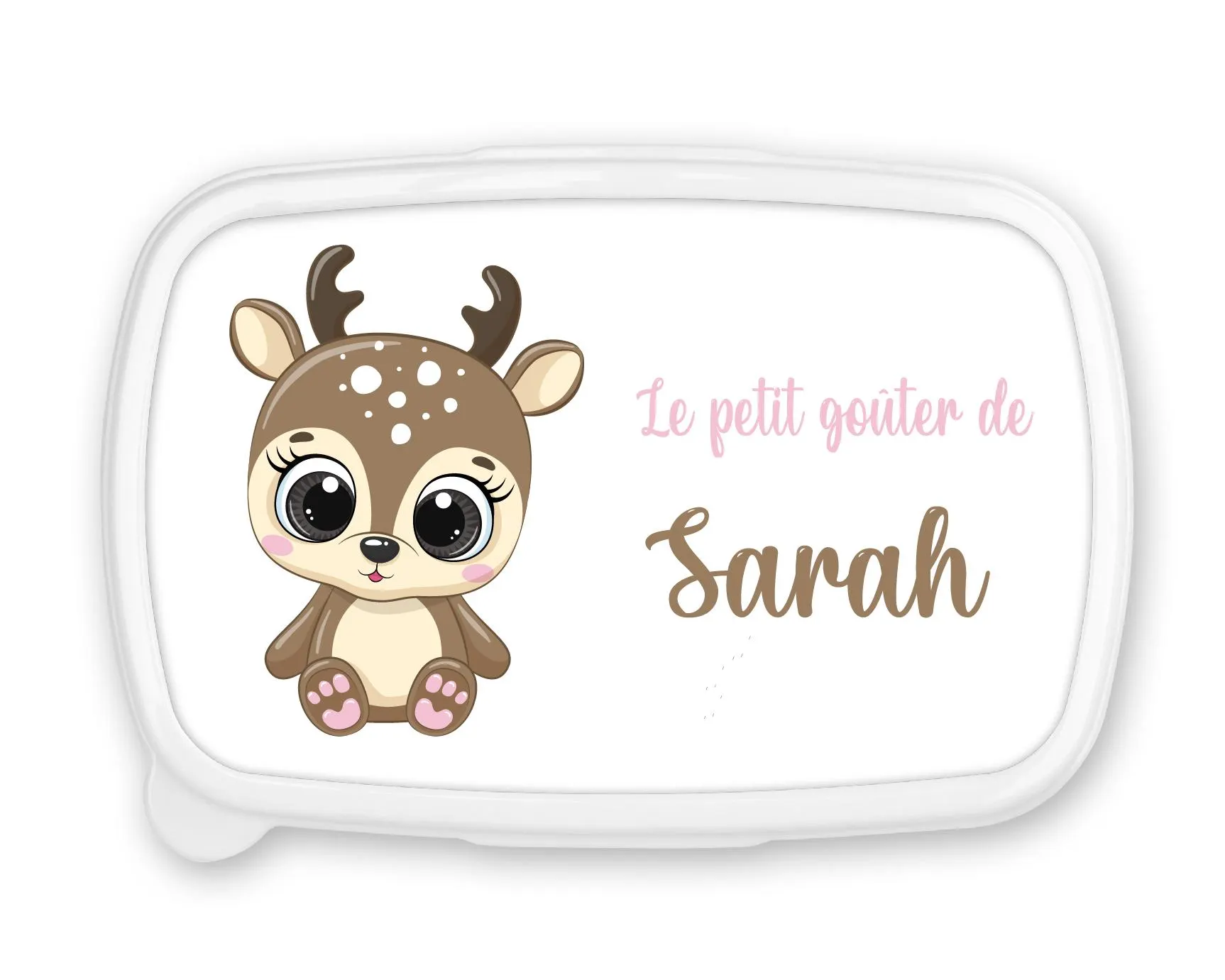 Craquez pour cette jolie boîte à goûter personnalisée avec le prénom de votre enfant, décorée d’un adorable petit faon aux grands yeux ! Sur un fond rose doux, elle est parfaite pour accompagner les petites filles à l’école, à la crèche ou en sortie scolaire.