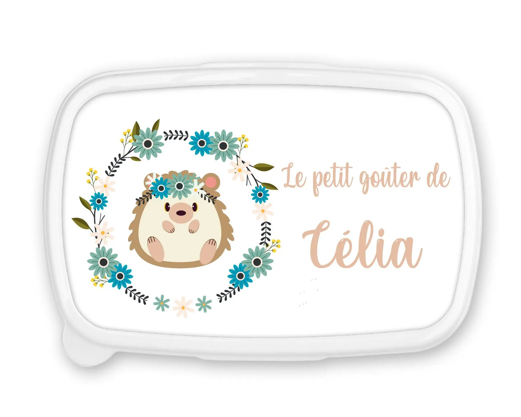 Préparez une rentrée pleine de douceur avec cette boîte à goûter personnalisée décorée d’un hérisson trop mignon entouré de fleurs colorées ! Son design tendre et enfantin convient aussi bien aux filles qu’aux garçons. Vous pouvez choisir le fond rose ou le fond bleu selon vos préférences.