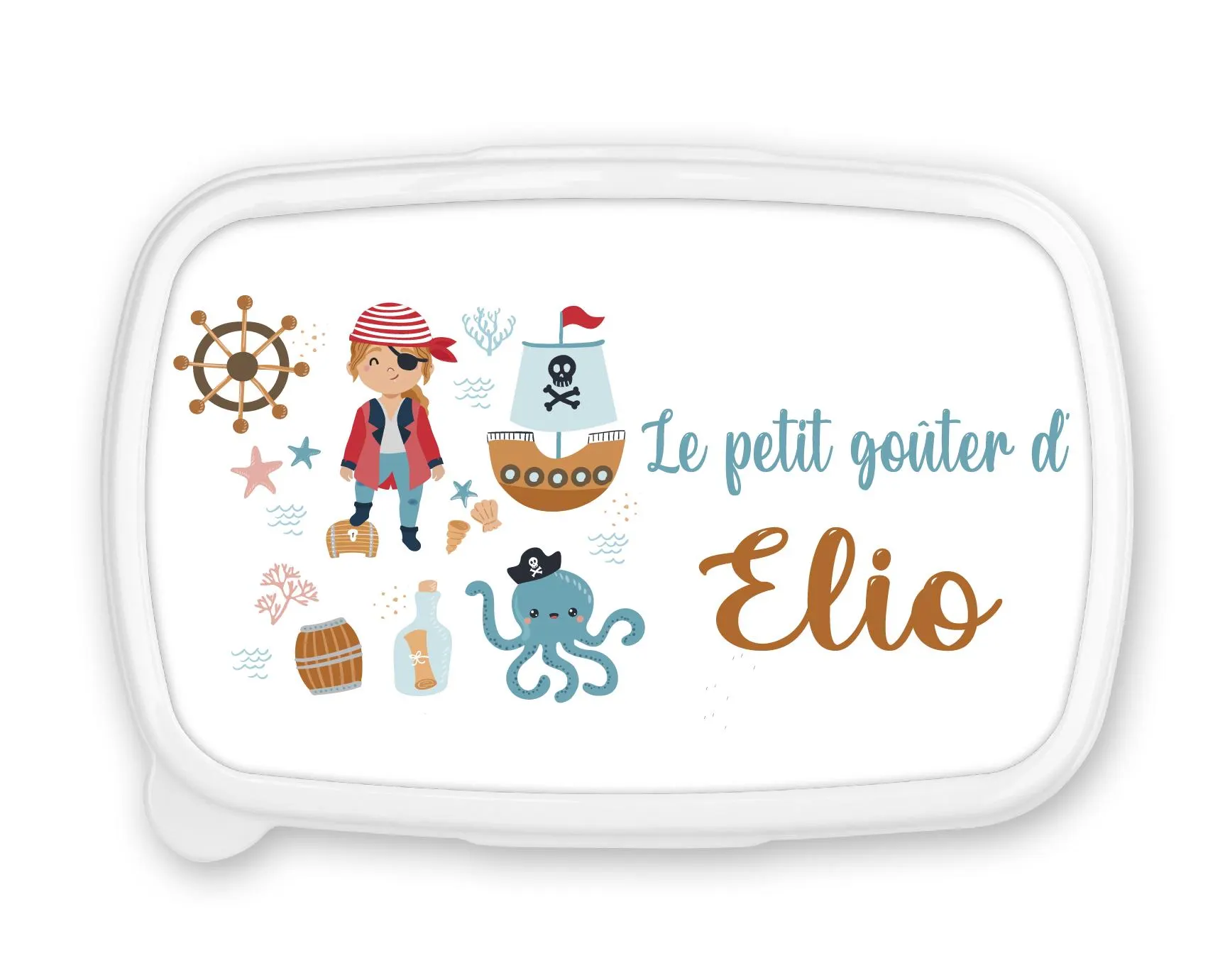À l’abordage de la rentrée scolaire avec cette boîte à goûter personnalisée sur le thème des pirates ! Parfaite pour les petits aventuriers, cette lunch box au fond bleu est illustrée d’un pirate, d’un navire, d’un poulpe et d’éléments marins rigolos. Le prénom de l’enfant est imprimé sur le couvercle, pour une boîte unique et identifiable à l’école.
