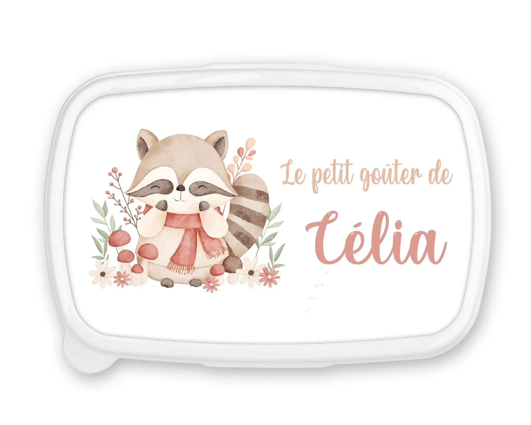 Adorable et pratique, cette boîte à goûter personnalisée au prénom de votre enfant met en scène un raton laveur câlin entouré de fleurs d’automne, dans un style aquarelle plein de douceur. Idéale pour les petites filles et les petits garçons, elle est disponible avec un fond bleu ou rose.