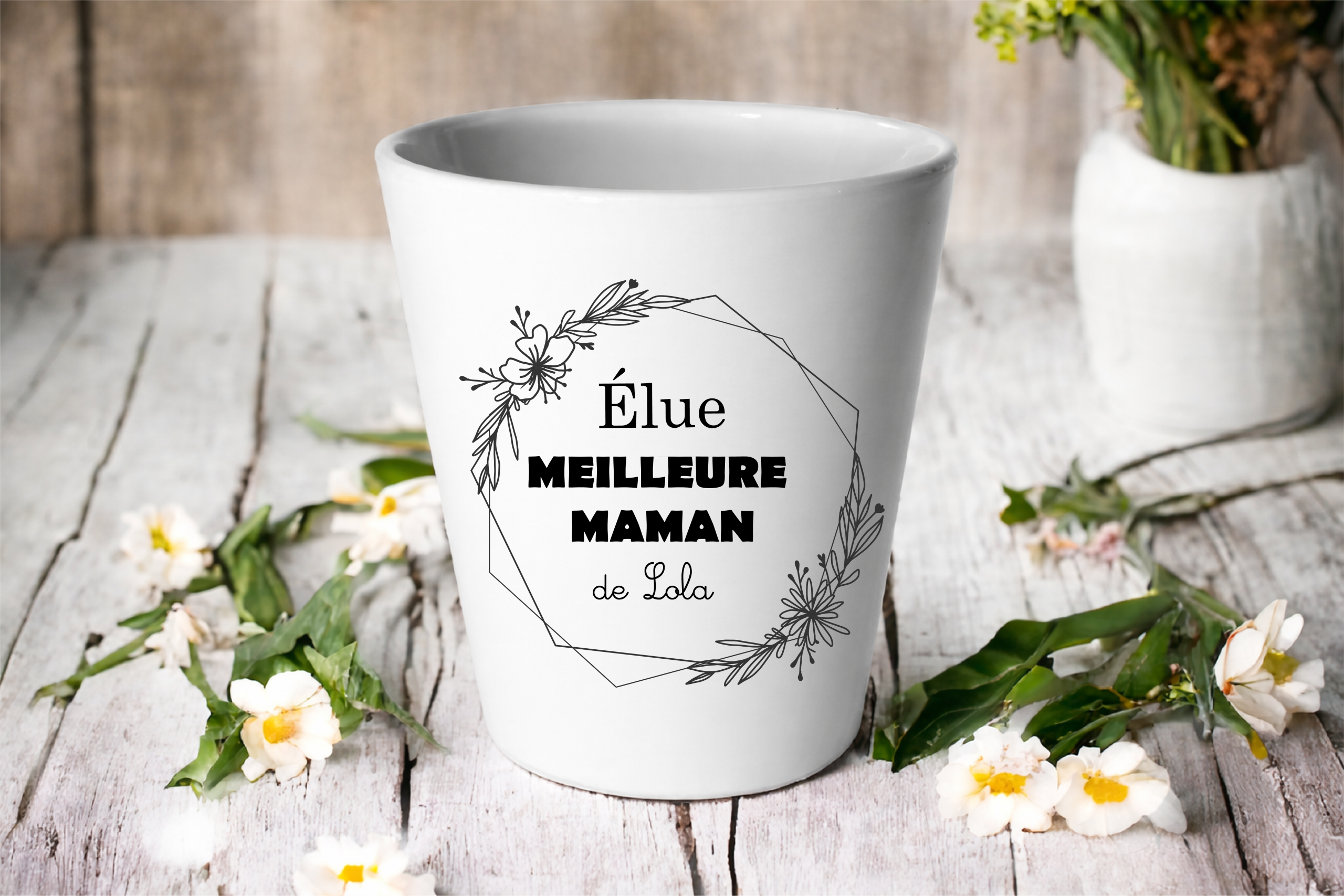 Ce joli cache-pot en céramique blanc brillant avec l’inscription “Élue meilleure maman” est personnalisé avec le prénom de l’enfant pour créer un souvenir unique et rempli d’émotion.