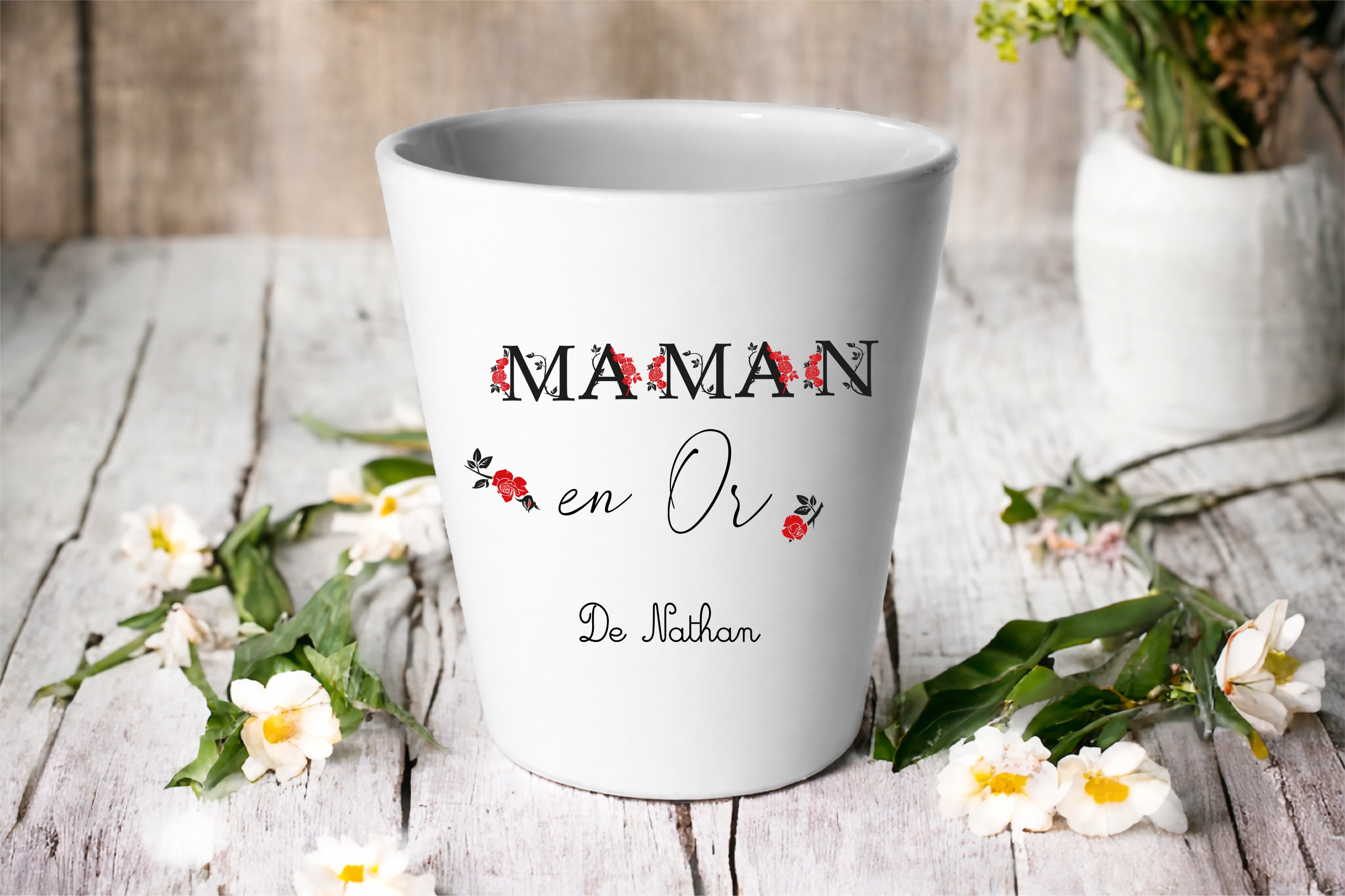 Son design élégant avec de délicates fleurs rouges met en valeur ce message rempli d’amour. Personnalisé avec le prénom de l’enfant, ce pot devient un objet souvenir unique que maman gardera longtemps.
