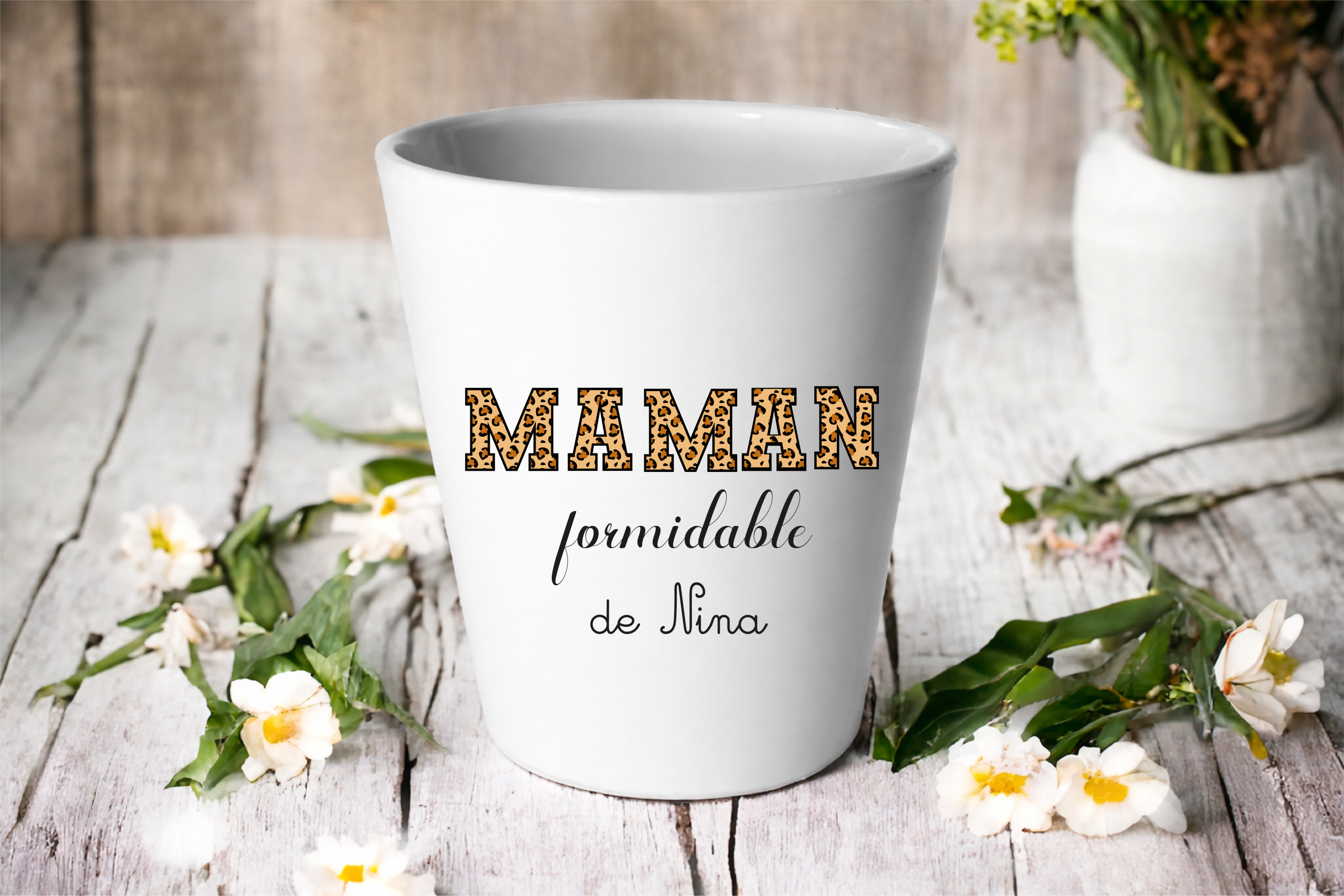 Son design élégant avec un effet motif léopard discret dans le mot MAMAN apporte une touche moderne et tendance. Personnalisé avec le prénom de l’enfant, ce cache-pot devient un souvenir unique et plein d’émotion.
