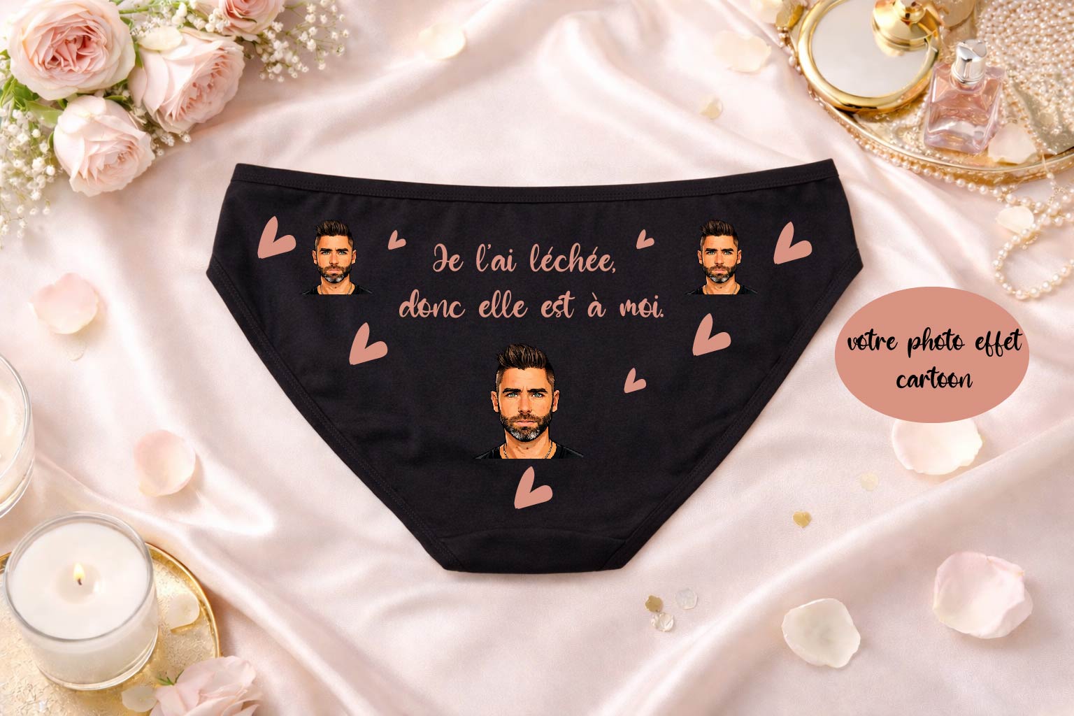 Cette culotte femme personnalisée est imprimée avec votre photo transformée en effet cartoon pour un rendu fun et original.