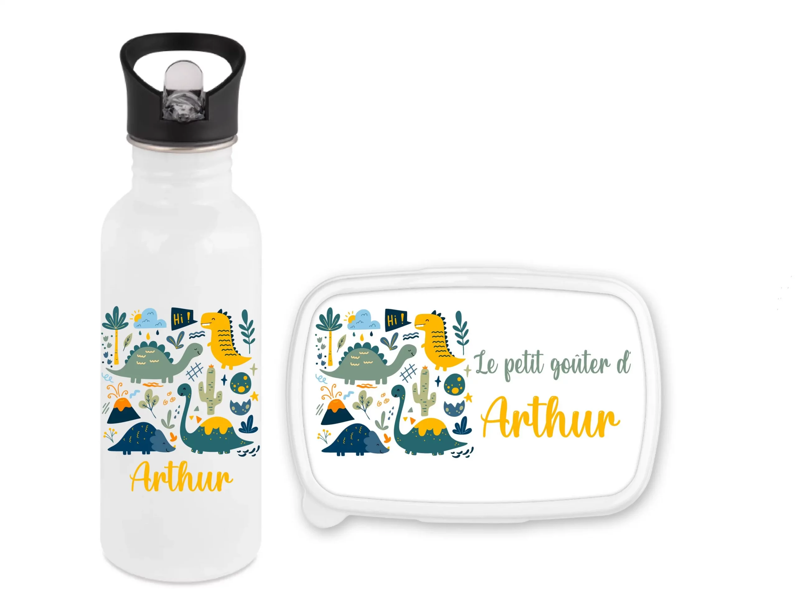 Les deux articles sont décorés d’un motif amusant de dinosaures jaunes 🦖 et personnalisés avec le prénom de votre enfant (exemple : Arthur) pour un cadeau unique et fonctionnel.