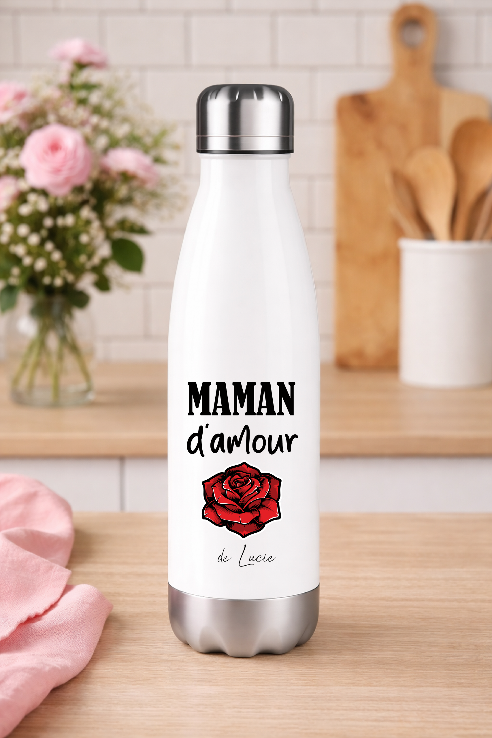 Cette gourde isotherme personnalisée « Maman d’amour » avec sa rose élégante est idéale pour la fête des mères.