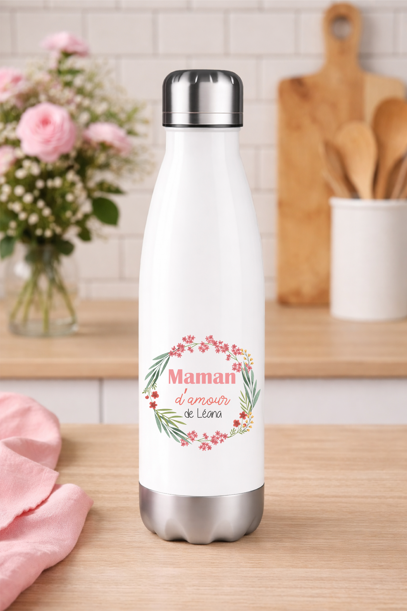 Cette gourde personnalisée « Maman d’amour » est décorée d’une jolie couronne florale aux tons doux, symbole de tendresse et d’amour. Un cadeau idéal pour une maman.