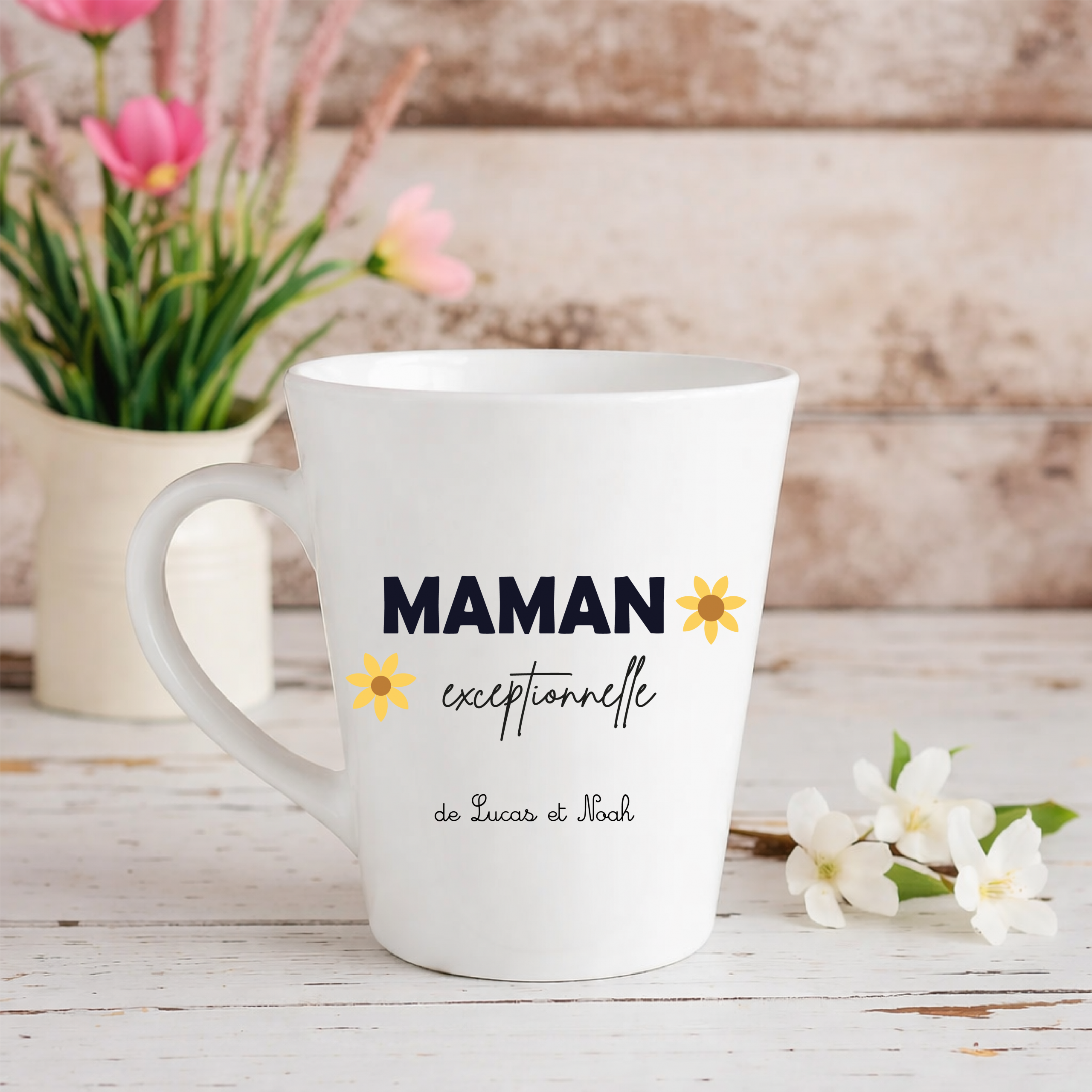 Ce joli mug conique en céramique blanche est décoré du message « Maman exceptionnelle » accompagné de fleurs délicates.