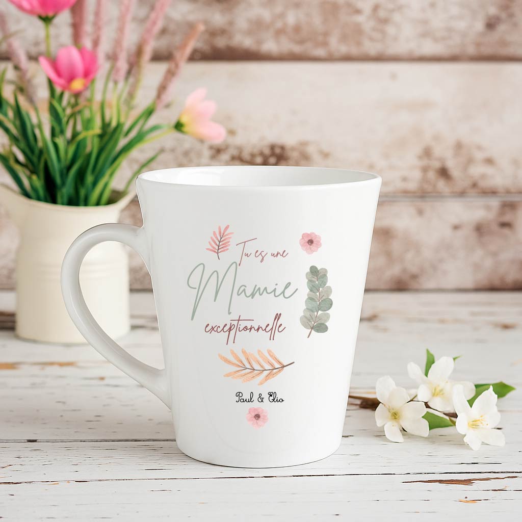 Ce mug conique en céramique arbore le message “Tu es une Mamie exceptionnelle”, accompagné d’illustrations florales délicates et de la personnalisation avec les prénoms des petits-enfants.