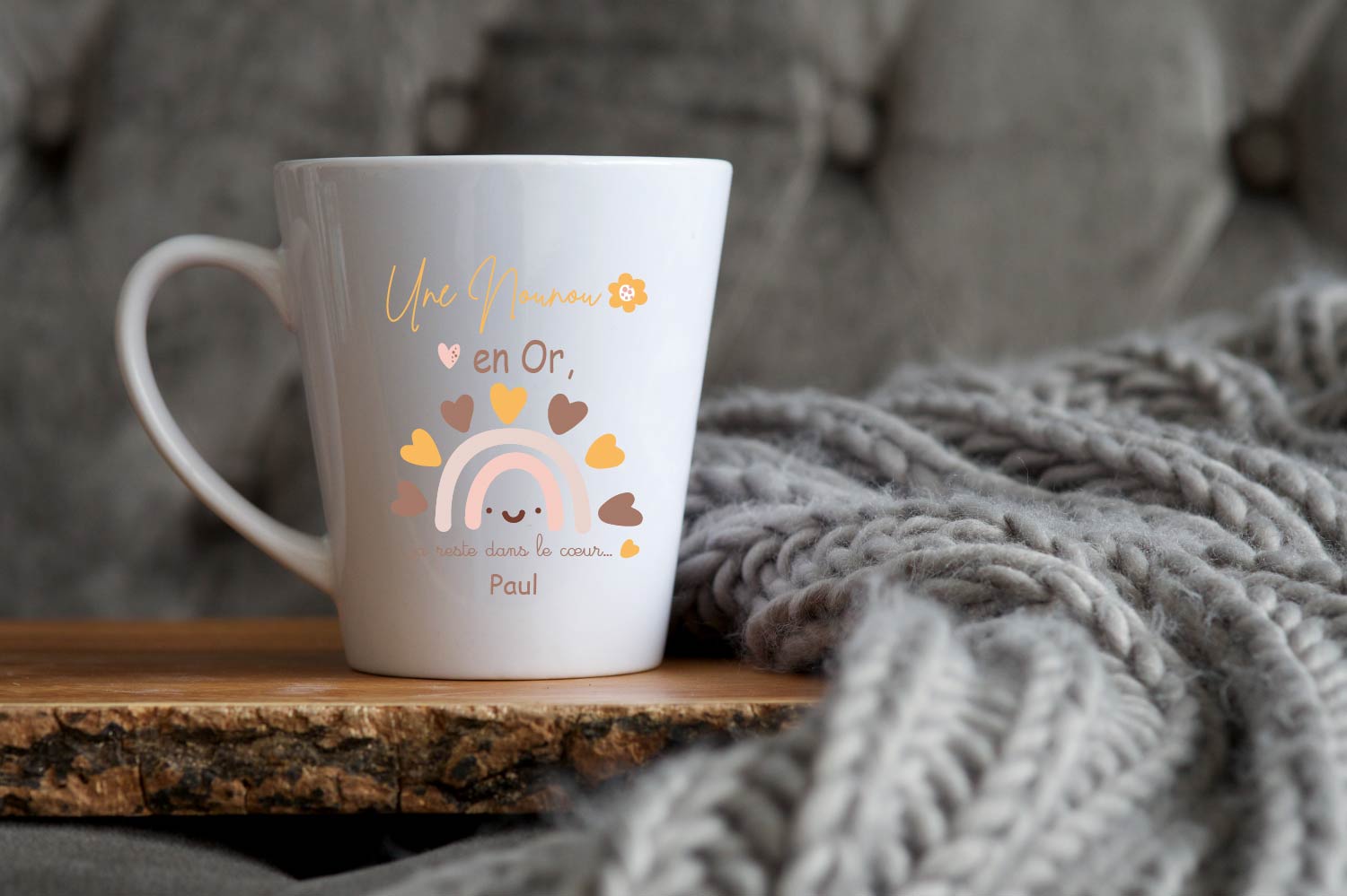 Ce mug conique personnalisé au design arc-en-ciel pastel et cœurs chaleureux est un cadeau plein de tendresse et de reconnaissance.