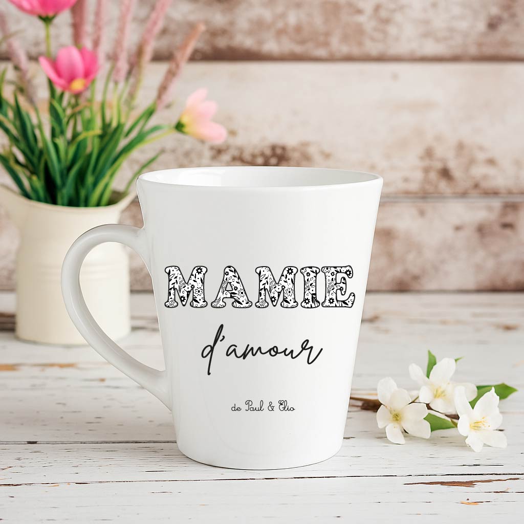 Un mug conique personnalisé “Mamie d’amour”, à offrir avec les prénoms des petits-enfants.