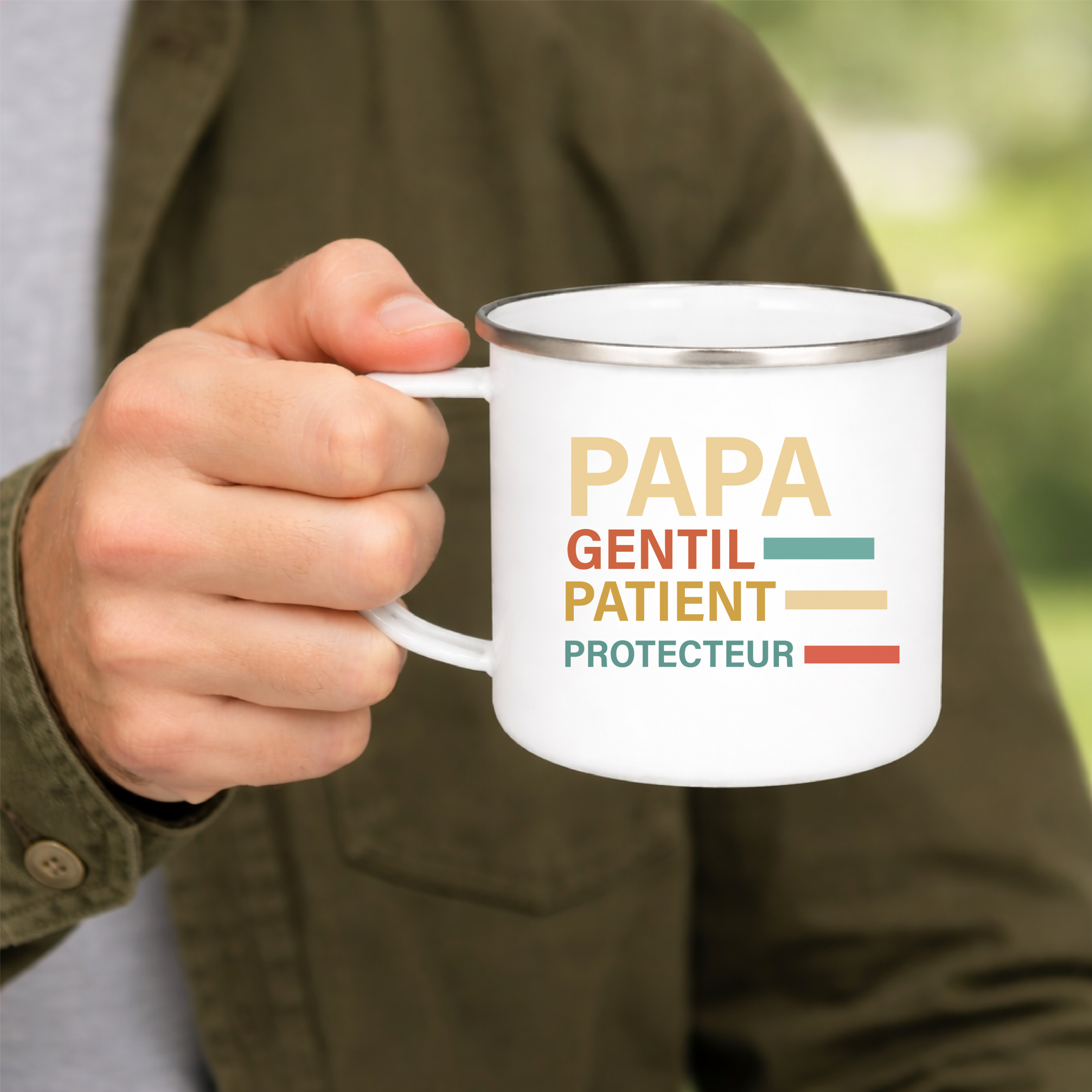 Avec son design moderne et ses mots forts “Papa gentil, patient, protecteur”, ce mug émaillé met en valeur toutes les qualités d’un papa.