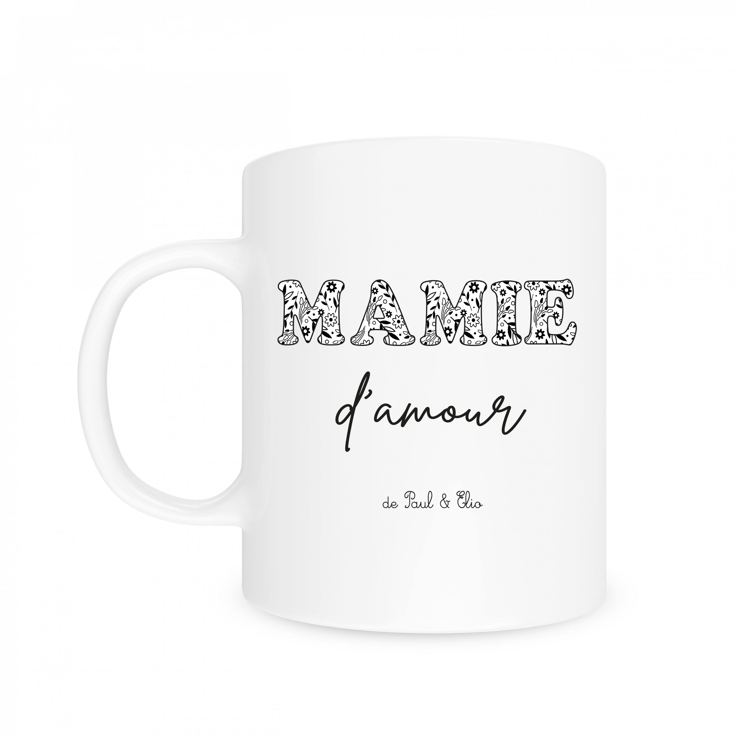 Personnalisé avec les prénoms des petits-enfants, ce mug en céramique blanche accompagnera votre mamie dans tous ses moments de douceur : café, thé ou chocolat chaud ☕🤍
