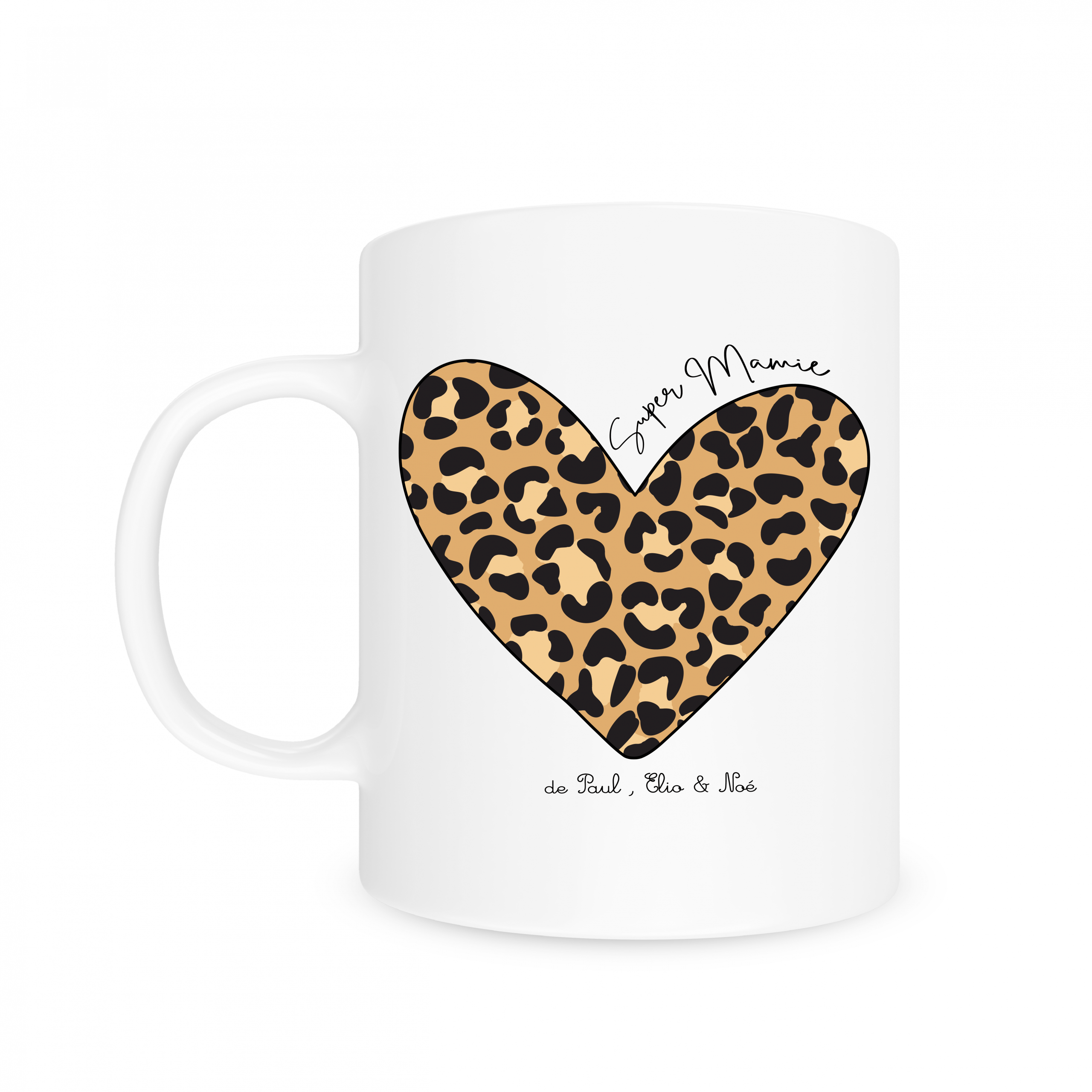 Faites fondre le cœur d’une mamie avec ce mug personnalisé “Super Mamie” au grand cœur léopard, à la fois tendre, moderne et plein de caractère 🐆🤎
