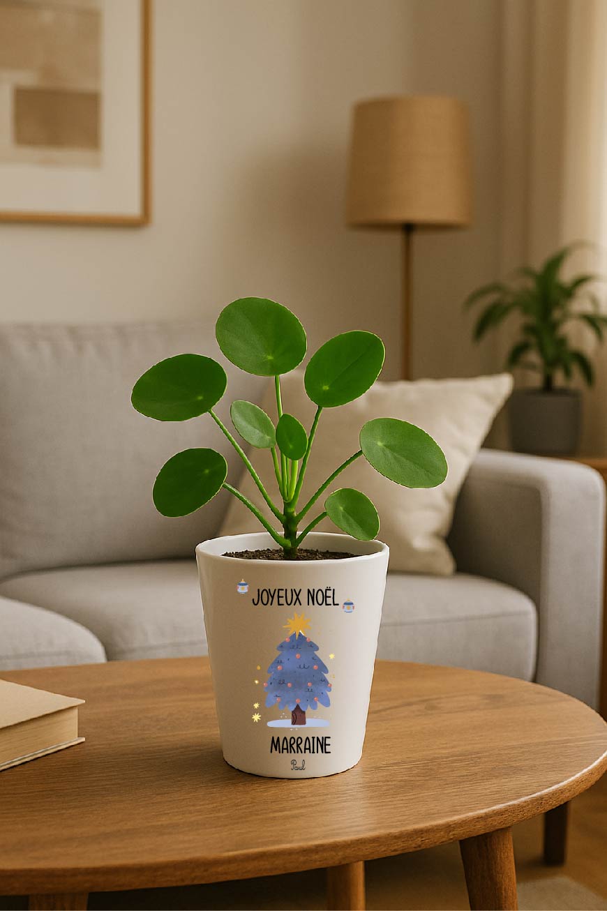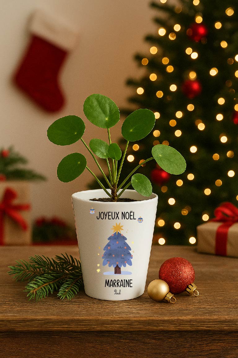 Petit pot décoratif de Noël avec sapin et “Joyeux Noël”. Surnom au choix (Marraine, Mamie, Nounou…) + prénom de l’enfant. Hauteur 10 cm, diamètre 9 cm, trou de drainage.