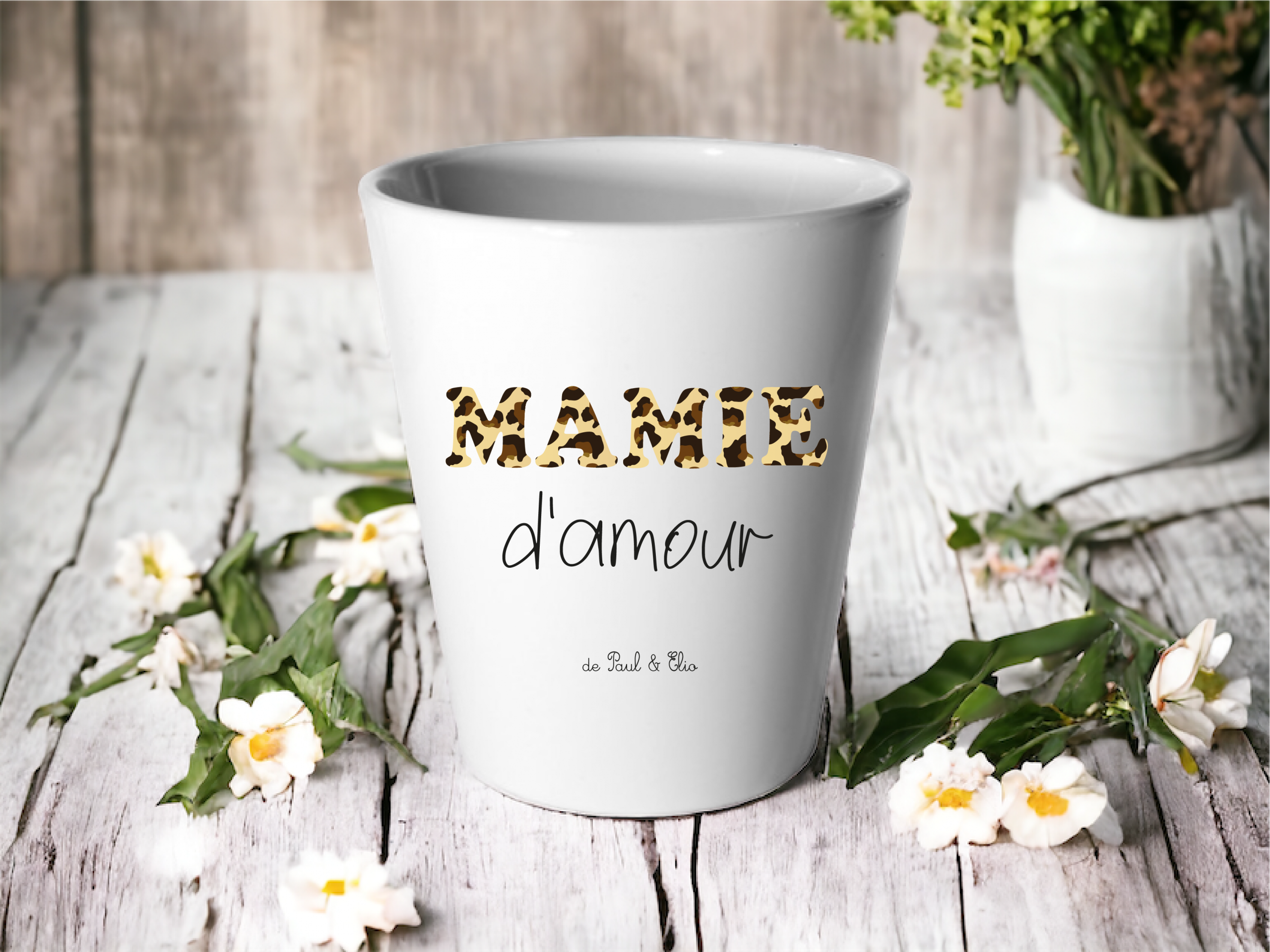 Ce pot personnalisé “Mamie d’amour”, avec son motif léopard élégant, est une attention pleine de style et de tendresse.