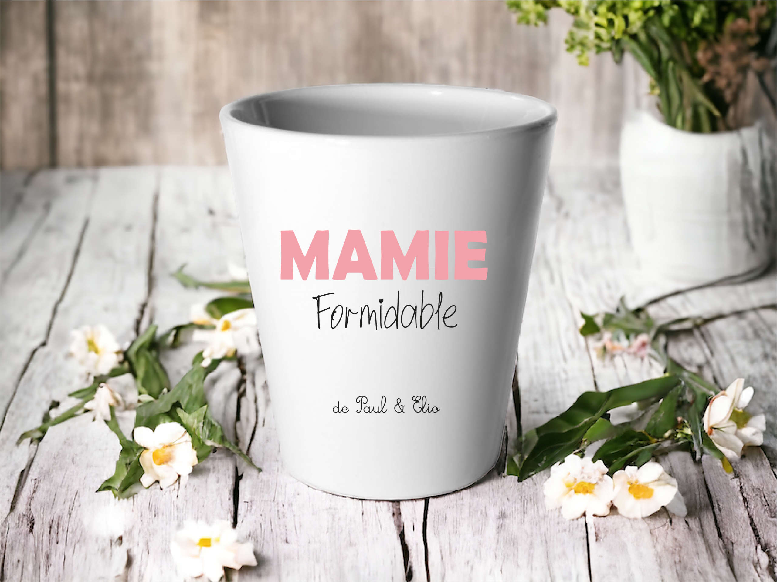 Avec son inscription moderne “Mamie Formidable” en rose et sa personnalisation avec les prénoms des petits-enfants, ce pot en céramique blanche est à la fois tendre, décoratif et intemporel.