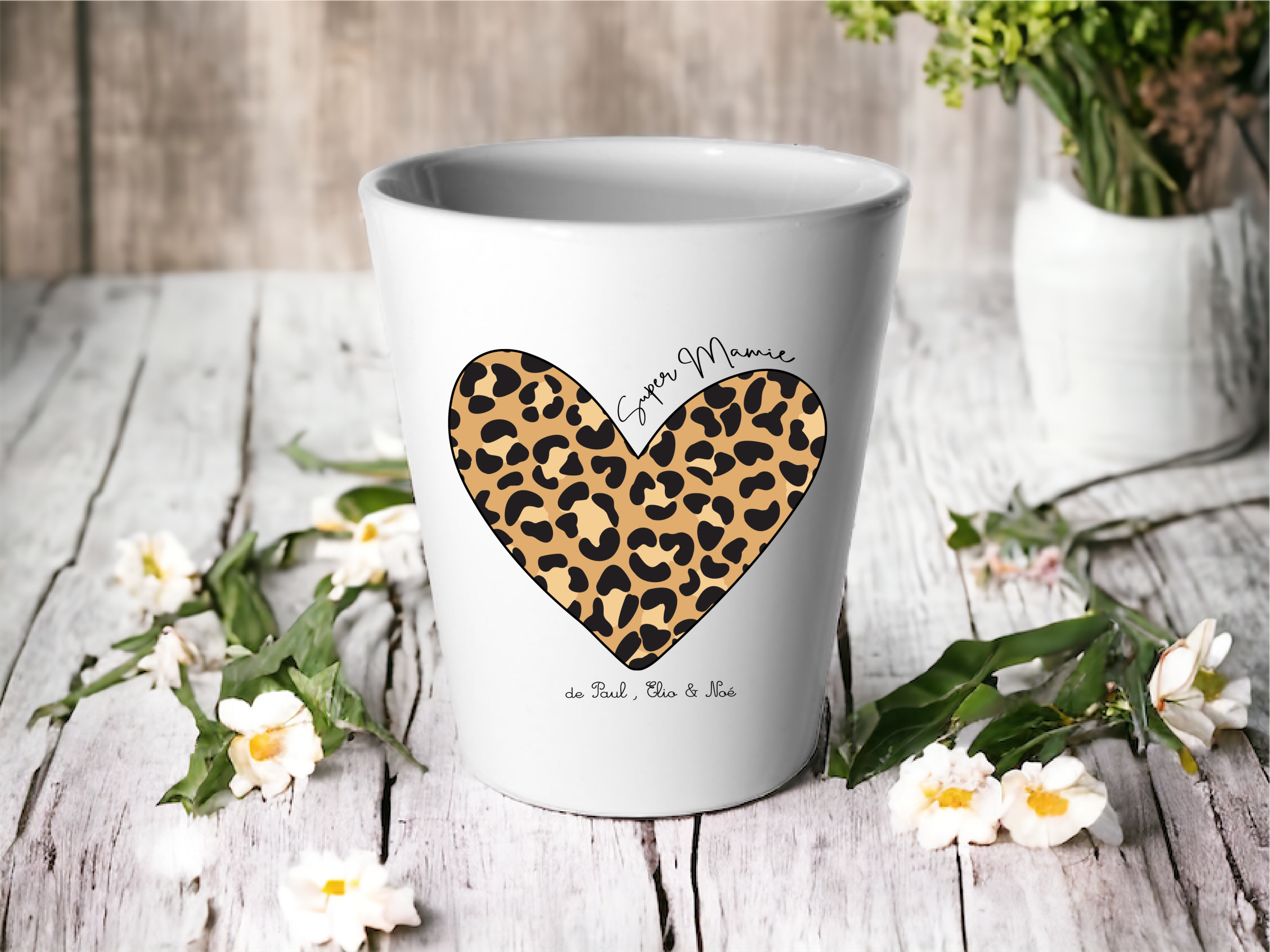 Ce pot personnalisé “Super Mamie”, décoré d’un joli cœur léopard, est le cadeau parfait pour une mamie moderne et pleine d’amour.