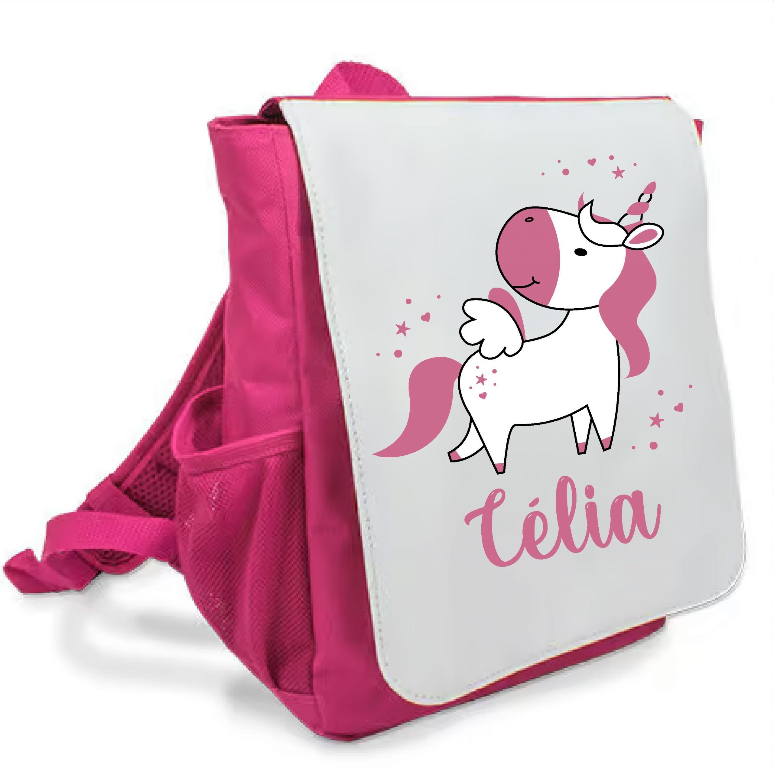 Ce modèle rose est orné d’une adorable licorne rose ailée entourée d’étoiles. Le prénom de votre enfant est imprimé sur un rabat amovible, pour un sac unique, coloré et évolutif.