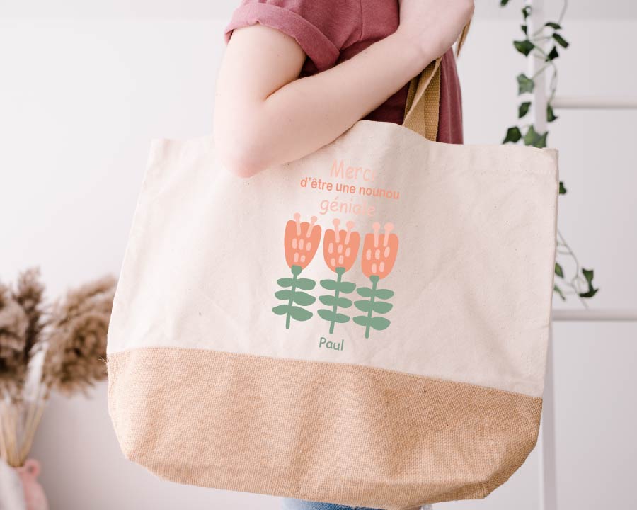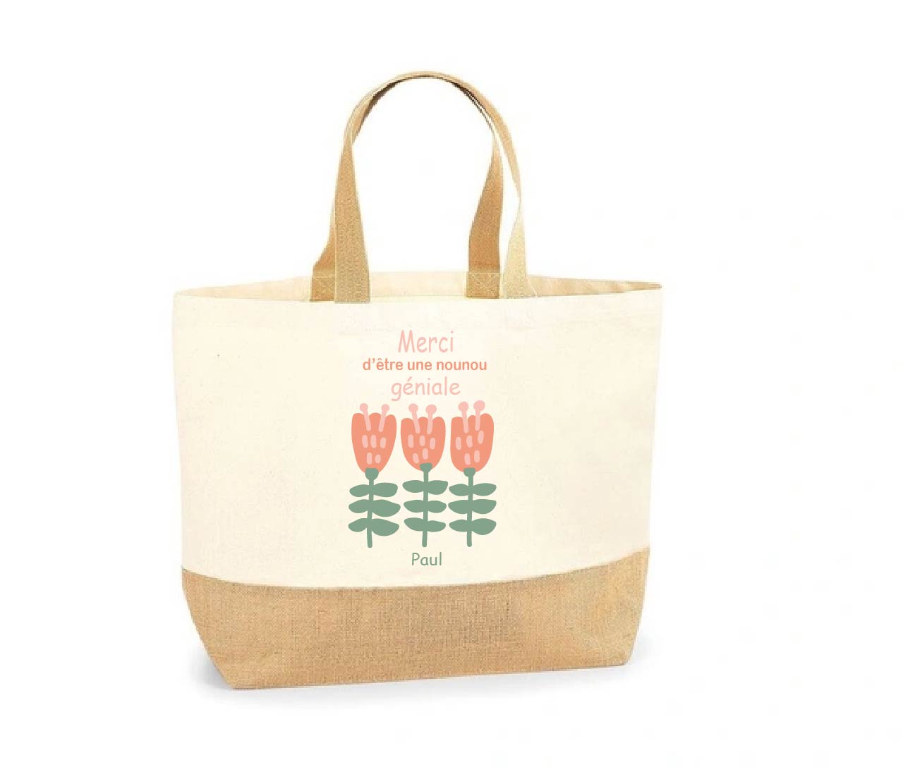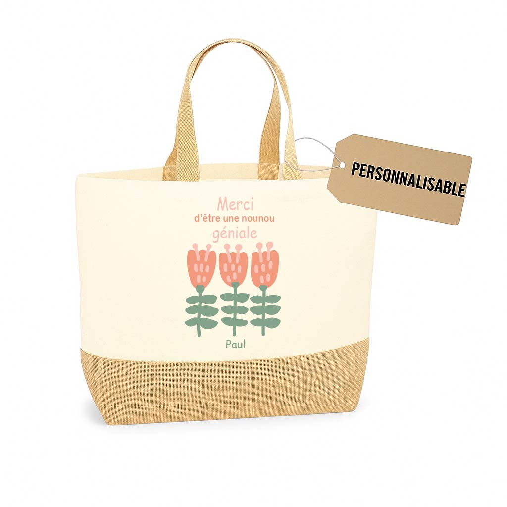Ce grand sac cabas en toile et jute est orné de fleurs pastel et du message “Merci d’être une nounou géniale”, personnalisable avec le prénom de l’enfant.