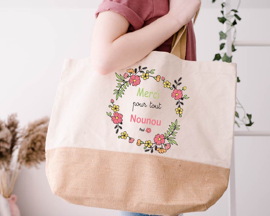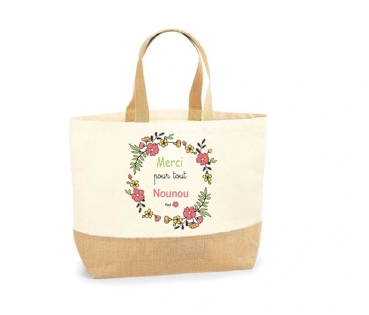 Ce grand cabas en toile et jute est orné d’une couronne de fleurs colorées et du message “Merci pour tout Nounou”.