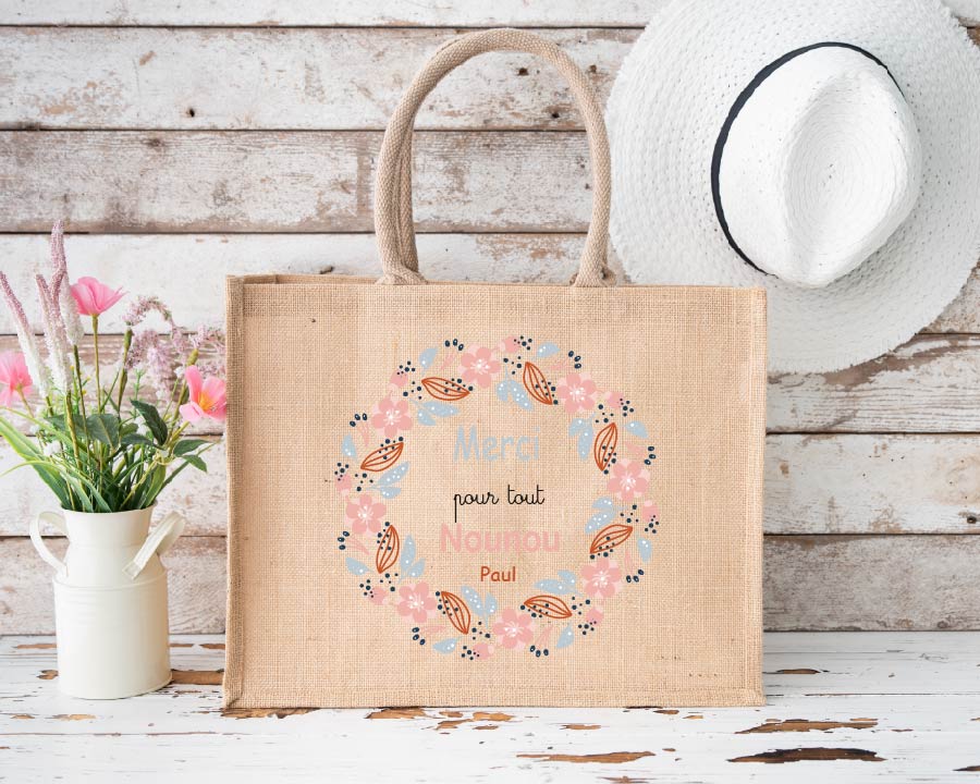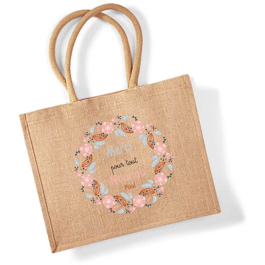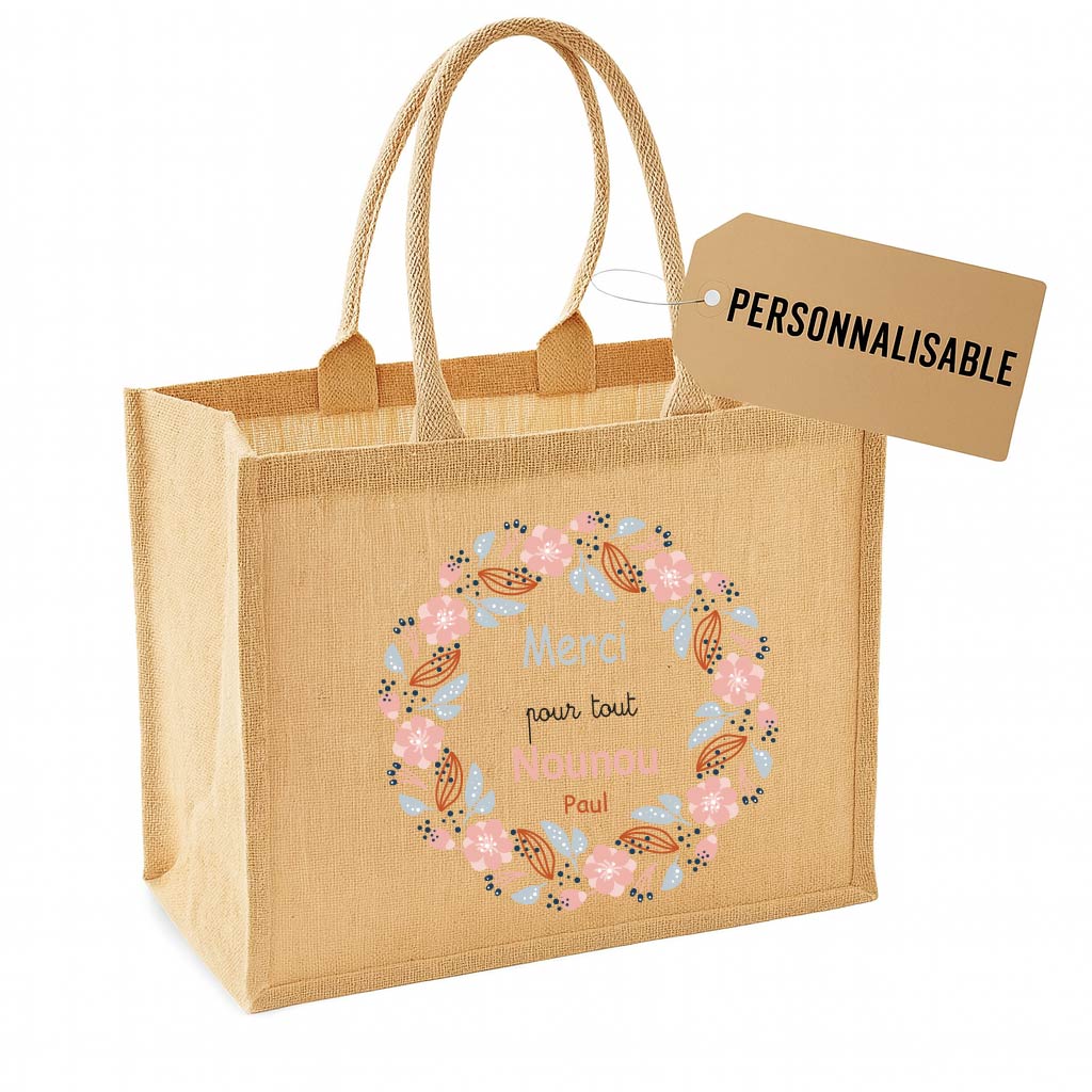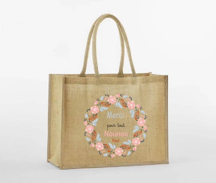 Offrez un joli souvenir à la nounou avec ce sac en jute “Meilleure Nounou du monde” 🌸