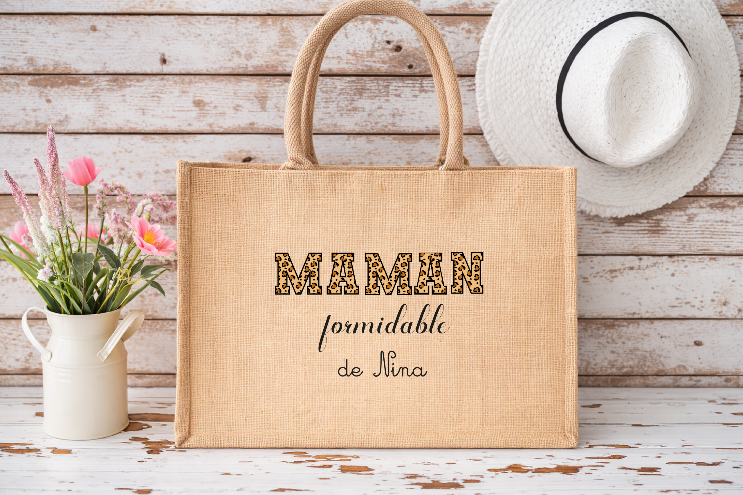 Offrez un cadeau plein de tendresse pour la Fête des Mères avec ce sac cabas en jute personnalisé « Maman formidable » 💐