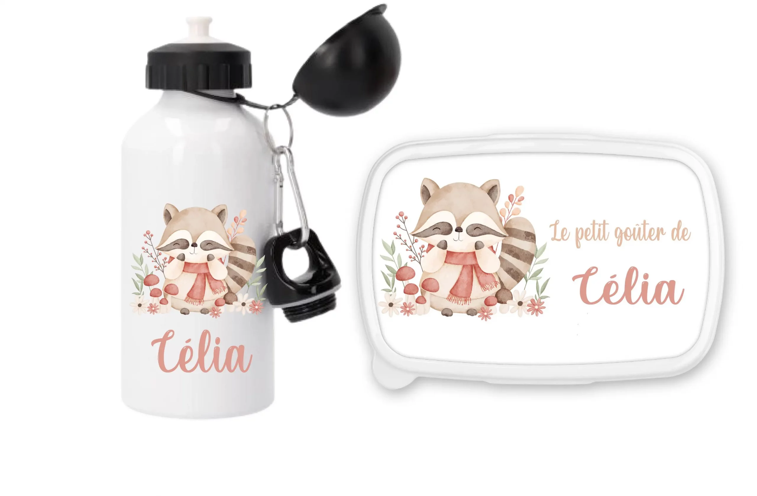 Craquez pour ce joli set composé d’une gourde et d’une boîte à goûter personnalisées avec le prénom de votre enfant. Le motif automnal avec le petit raton laveur emmitouflé dans son écharpe est parfait pour une rentrée tout en douceur !