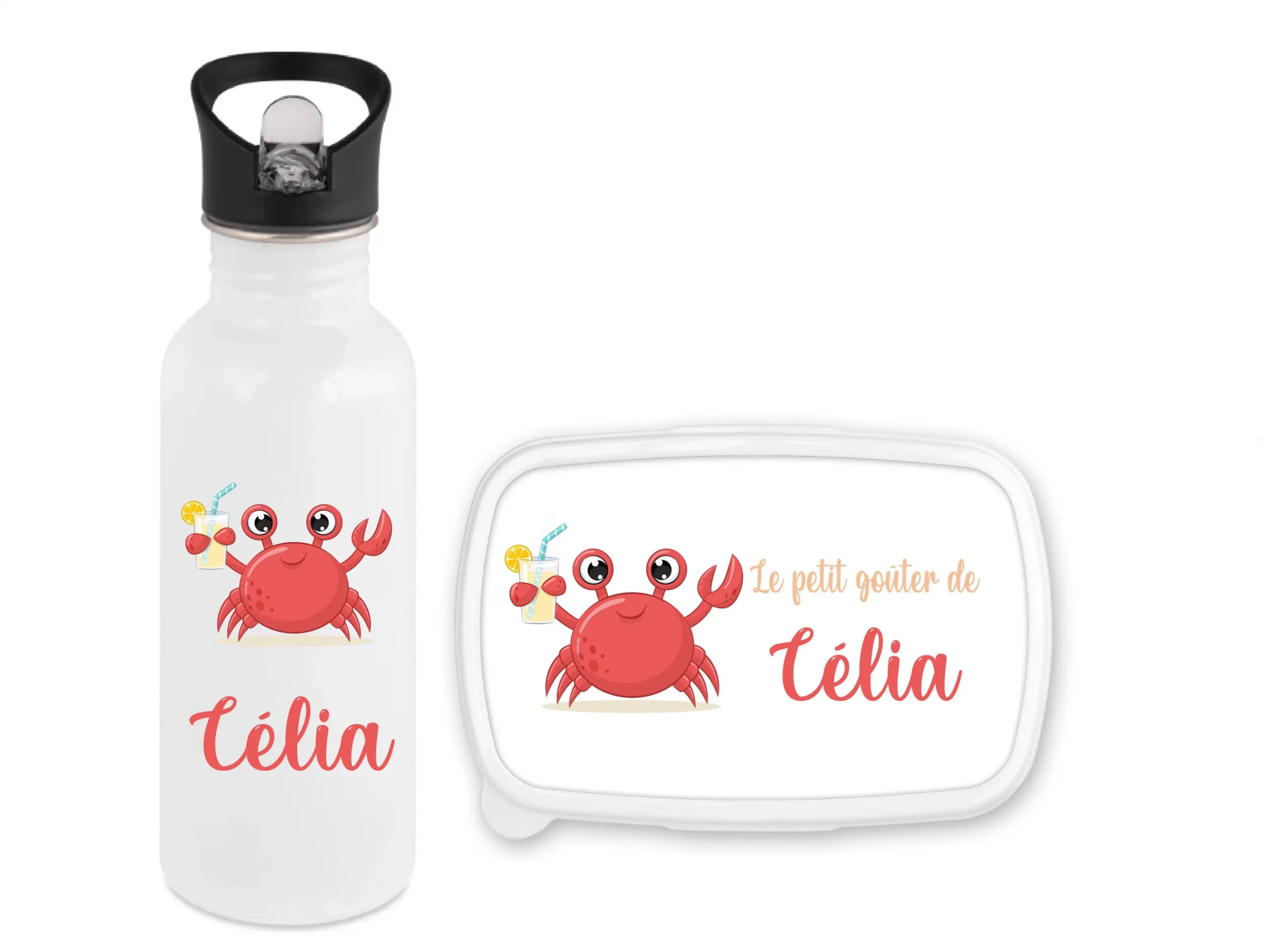 Set gourde paille 600 ml + boîte à goûter fond rose avec motif crabe rose. Prénom personnalisable (exemple Célia). Parfait rentrée scolaire. Compatible lave-vaisselle.