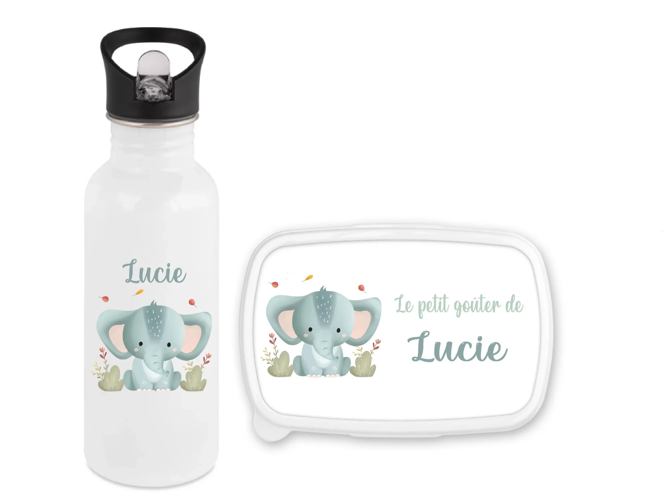 Set gourde paille 600 ml + boîte à goûter personnalisés motif éléphant bleu – Prénom enfant – Rentrée scolaire