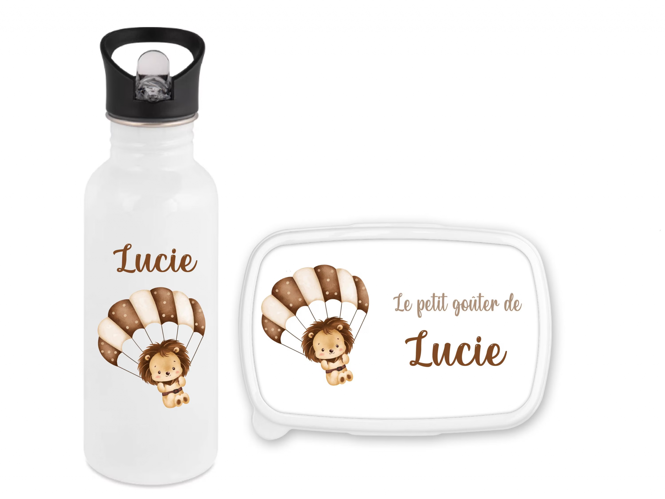 Set gourde paille 600 ml + boîte à goûter personnalisés motif lion – Prénom enfant – Rentrée scolaire