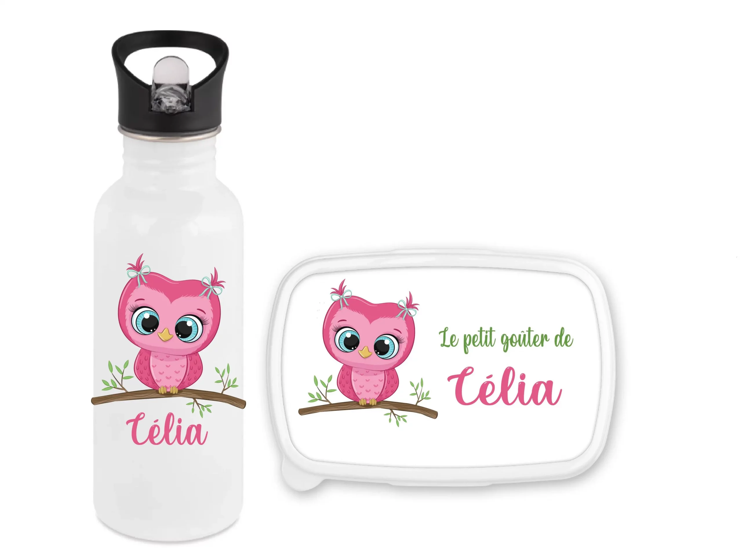 Set gourde paille + boîte à goûter personnalisés hiboux rose – Prénom enfant – Parfait pour la rentrée scolaire