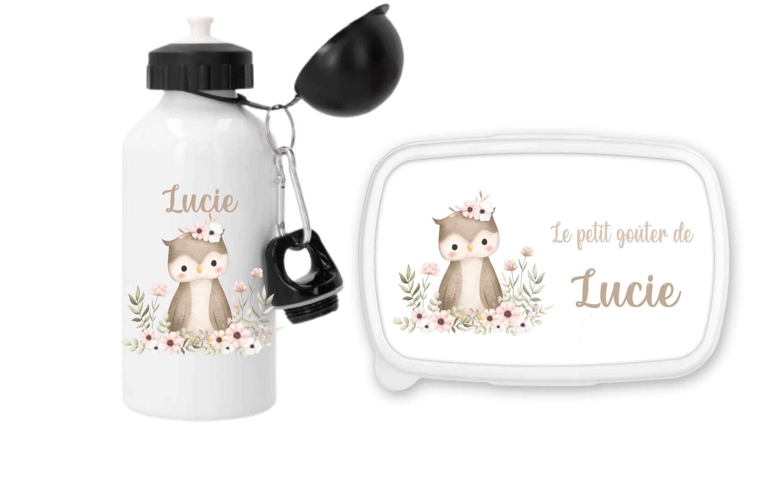 Ce set complet accompagne votre enfant à la rentrée scolaire : gourde sport 500 ml personnalisée et boîte à goûter assortie avec fond rose, décorés du motif chouette. Personnalisez avec le prénom pour une rentrée pleine d’énergie.