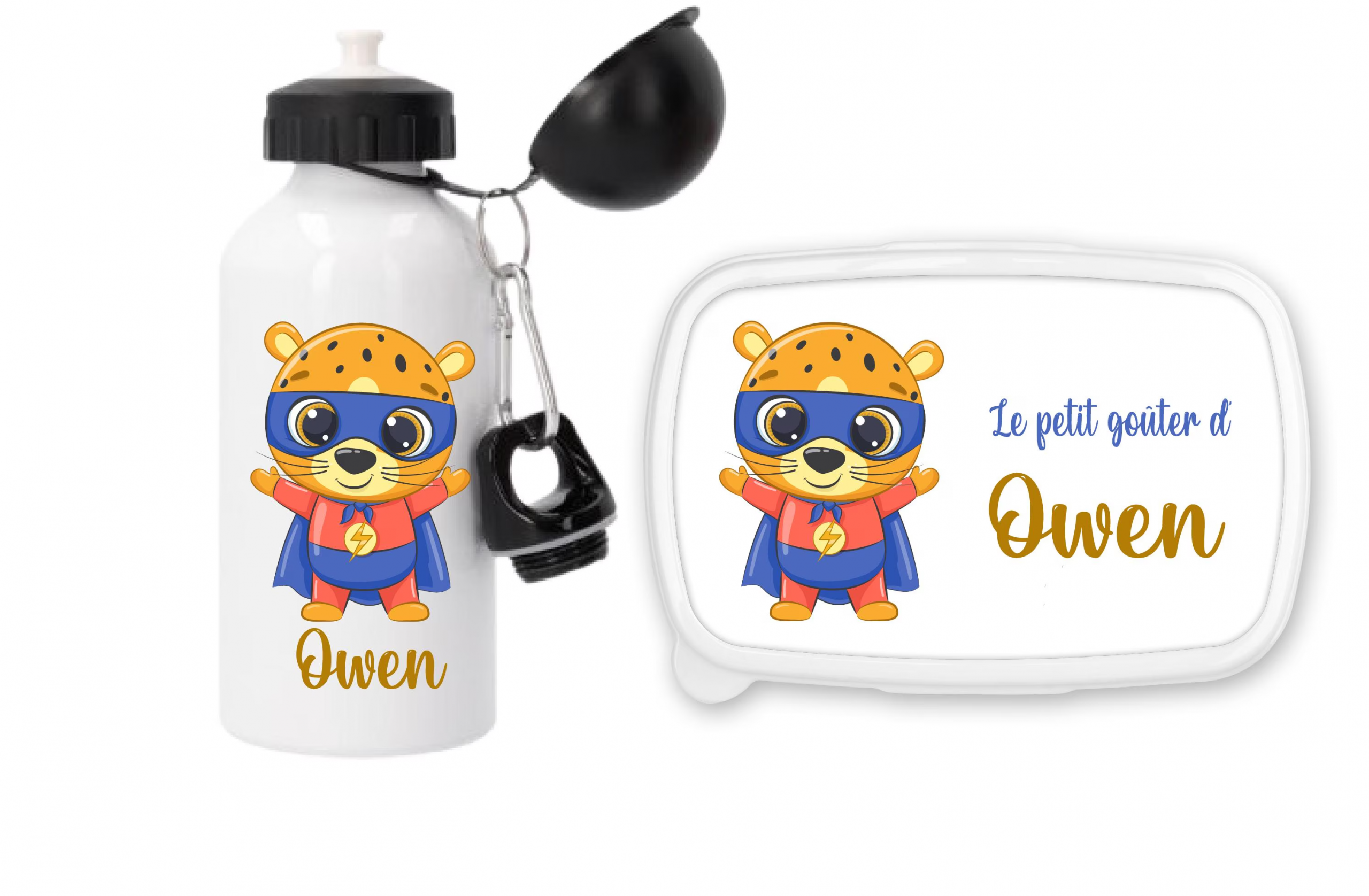 Ce set complet accompagne votre enfant à la rentrée scolaire : gourde sport 500 ml personnalisée et boîte à goûter assortie avec fond bleu, décorés du motif ours super-héros. Personnalisez avec le prénom pour une rentrée pleine d’énergie.
