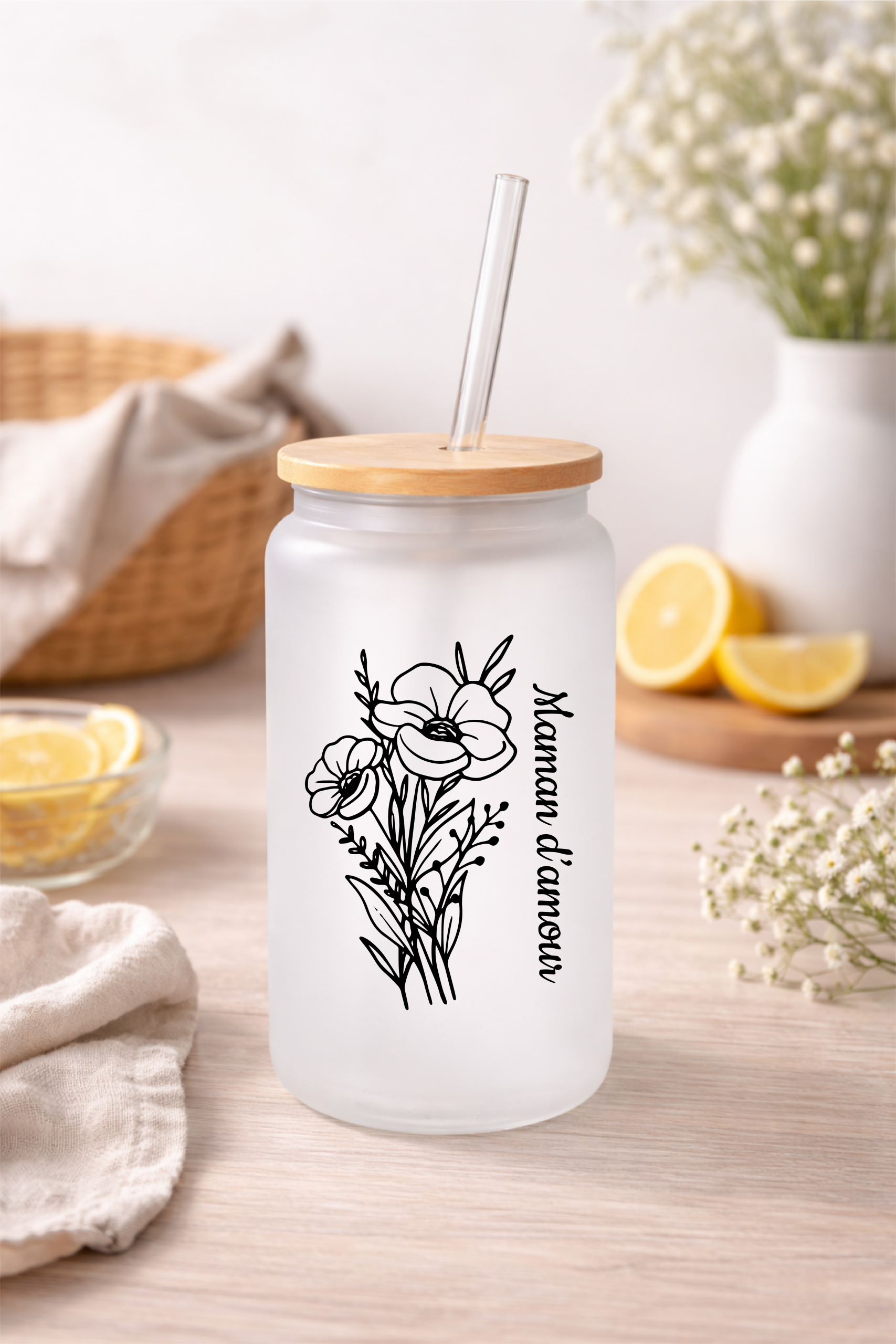 Ce verre canette givré « Maman d’amour » avec motif floral est parfait pour la fête des mères.